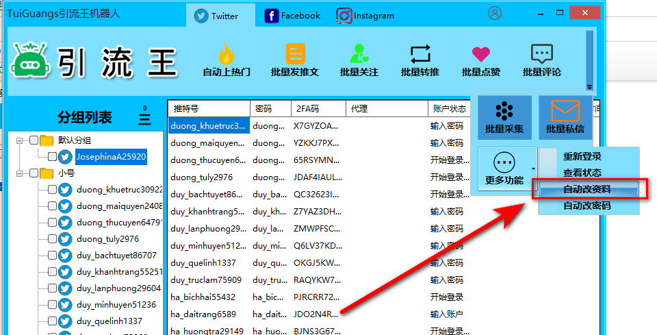在【更多】当中选择【自动改资料】按钮,打勾要修改资料的推特号,然后批量导入头像图片,一个号对应一张图片支持批量导入批量设置点击【添加】就可以了...